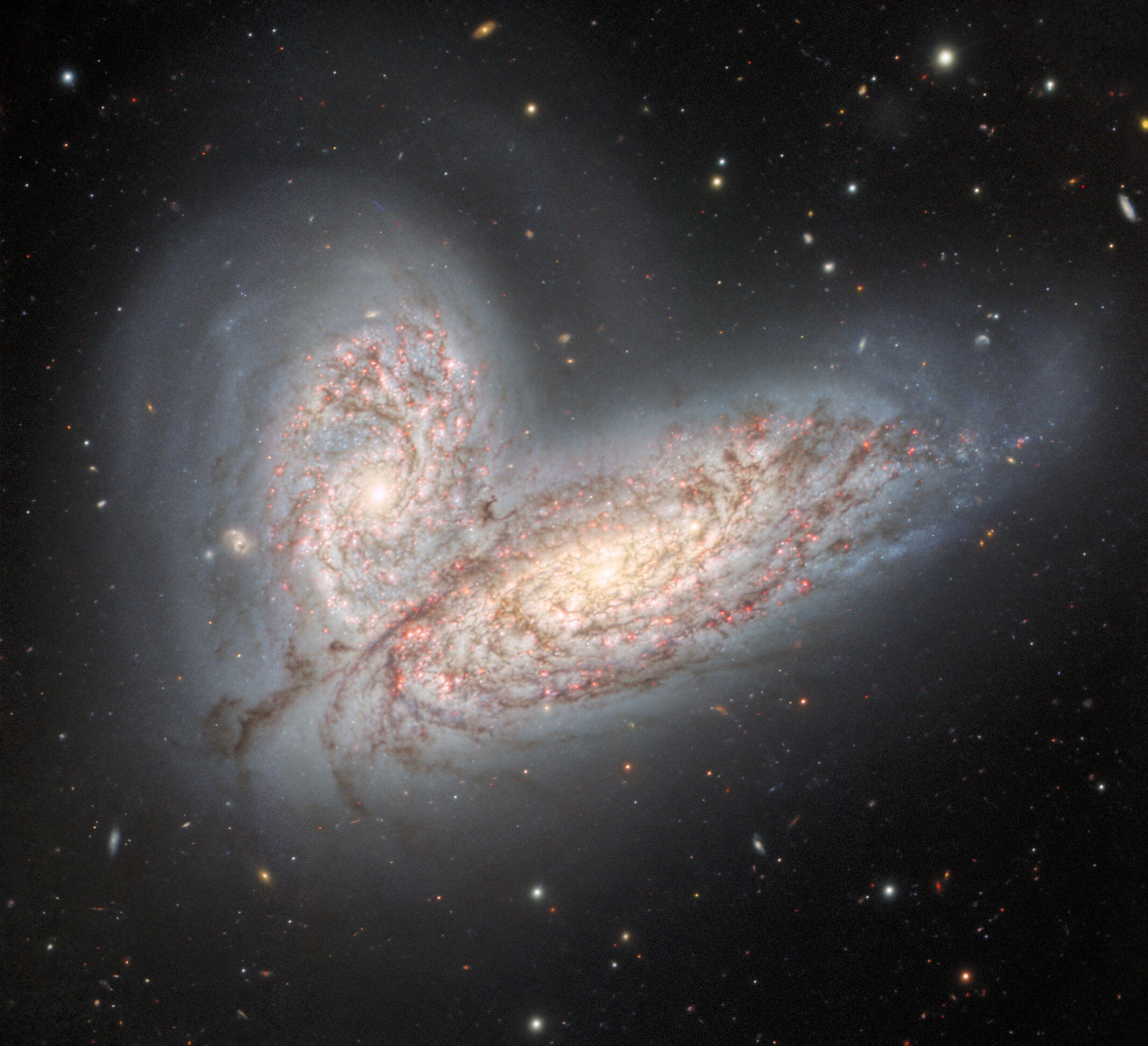 The two galaxies Gemini caught a view of are well known to amateur astronomers as the Butterfly Galaxies. You need a good telescope and a long exposure to see them. When you do, you'll be looking across about 40 million light-years of space in the direction of the constellation Virgo. That's what Gemini North did, also. At this moment of cosmic time, we see these lovely spirals when they're fairly far apart—about 20,000 light-years from each other. They still look fairly "normal". However, as their interaction proceeds, their combined gravitational pulls will distort their shapes.