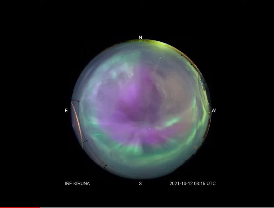 This camera is pointed straight up, and is fitted with a fish-eye lens to be able to capture the sky from horizon to horizon. The Aurora Borealis, also known as the Northern Lights, were visible due to the impact of a coronal mass ejection (CME) into our planet's magnetosphere on October 12. A solar storm on the Sun ejected a ejected a violent mass of fast-moving plasma into space on October 9, 2021. A few days later, aurora were seen around the world in the northern hemisphere.