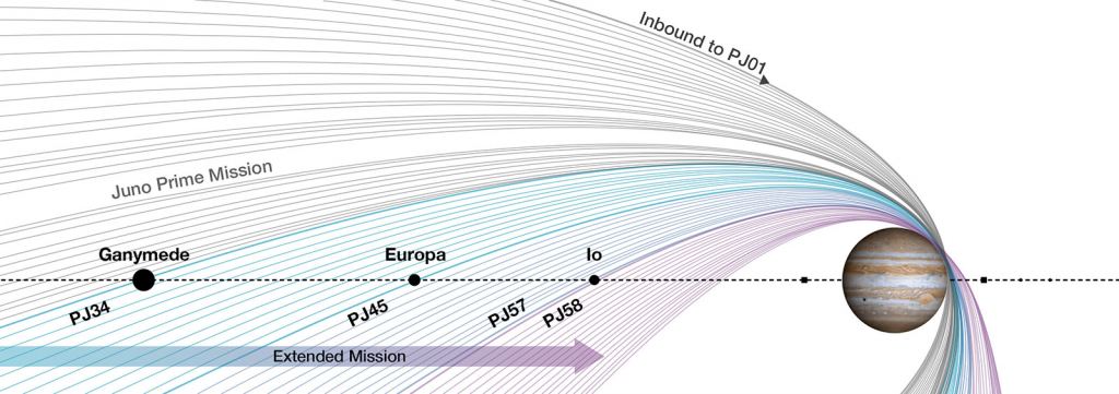 Juno's extended mission allows the spacecraft to continue its investigations through September 2025. The low-altitude flyby of Ganymede on June 7, 2021 (Perijove 34), reduced the orbital period from about 53 days to 43 days. That flyby sets up a close flyby of Europa on Sept. 29, 2022 (Perijove 45), reducing the orbital period further to 38 days. A pair of close Io flybys, on Dec. 30, 2023 (Perijove 57), and Feb. 3, 2024 (Perijove 58), combine to reduce the orbital period to 33 days.