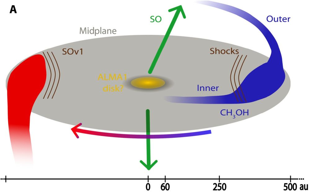 *This schematic from the research shows the different kinematic components and flow scenarios for the protostar ALMA1. Green arrows represent outflows, the blue and red represent the streamers of gas, and the red to blue arrow shows rotation. Image Credit: Olguin et al. 2025. SciAdv*