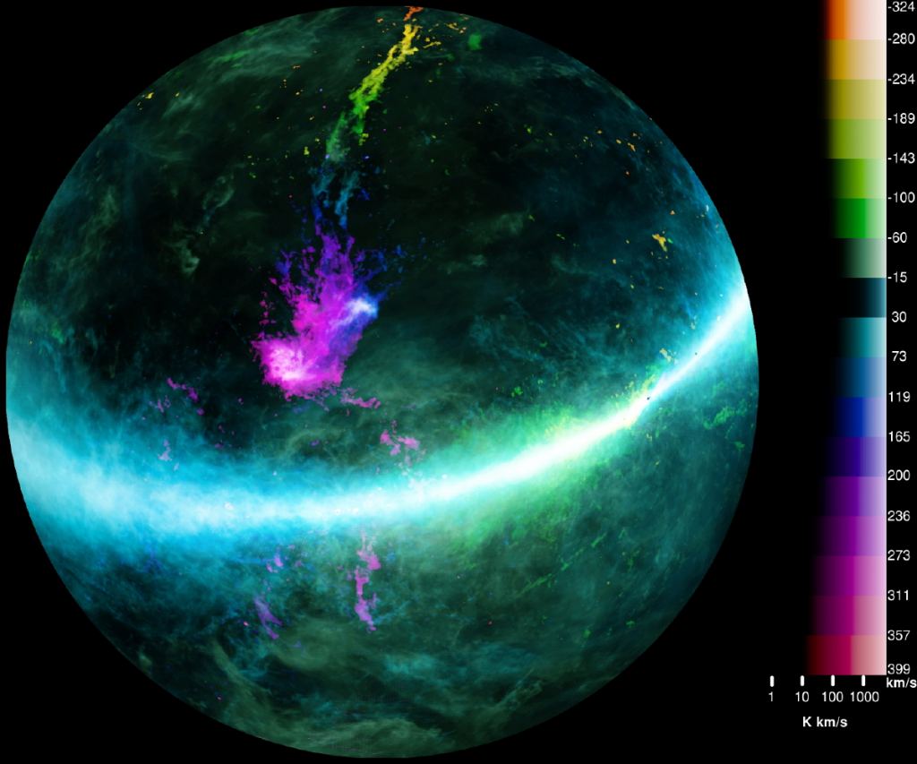 The GASS survey was made by the Parkes radio telescope in Australia and captured radio emissions from neutral hydrogen gas seen in the Southern Hemisphere. Since HVCs are mostly made of neutral hydrogen, they are contained in the GASS data. But GASS only tells us the direction and relative motion of these clouds, so the team had to estimate their distance. They did this by comparing the motion of the HVCs relative to the motion of the Magellanic clouds. Also, since GASS only observed portions of the southern sky, the authors used Bayesian statistics to calculate the distribution of HVCs within the entire galaxy.