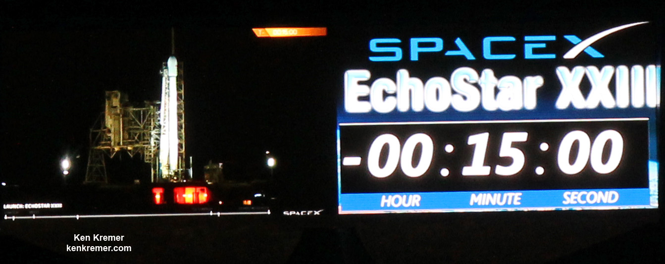 The countdown clock at NASA's Kennedy Space Center shows the progress of the SpaceX Falcon launch attempt with the EchoStar 23 telecomsat from historic Launch Complex 39A after midnight March 14. Liftoff has been rescheduled for March 16 at 1:35 a.m. EDT. Credit: Ken Kremer/Kenkremer.com[/caption]