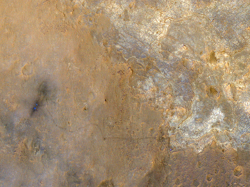 I spy the Curiosity Rover! With the Sun over its shoulders, the High Resolution Imaging Science Experiment (HiRISE) camera on the Mars Reconnaissance Orbiter snapped this image of the Curiosity rover on June 27, 2013, when Curiosity was at an outcrop called "Shaler" in the "Glenelg" area of Gale Crater. The rover appears as a bluish dot near the lower right corner of this enhanced-color image, and also visible are the rover's tracks.