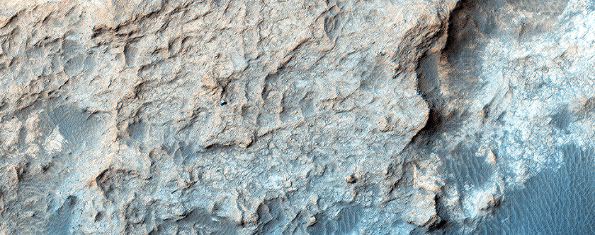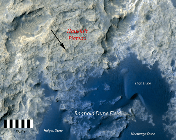 Recent images from HiRise show the Mars Science Laboratory (MSL) Curiosity on a feature called the Naukluft Plateau. The Plateau is named after a mountain range in Namibia, and is the site of Curiosity's 10th and 11th drill targets.