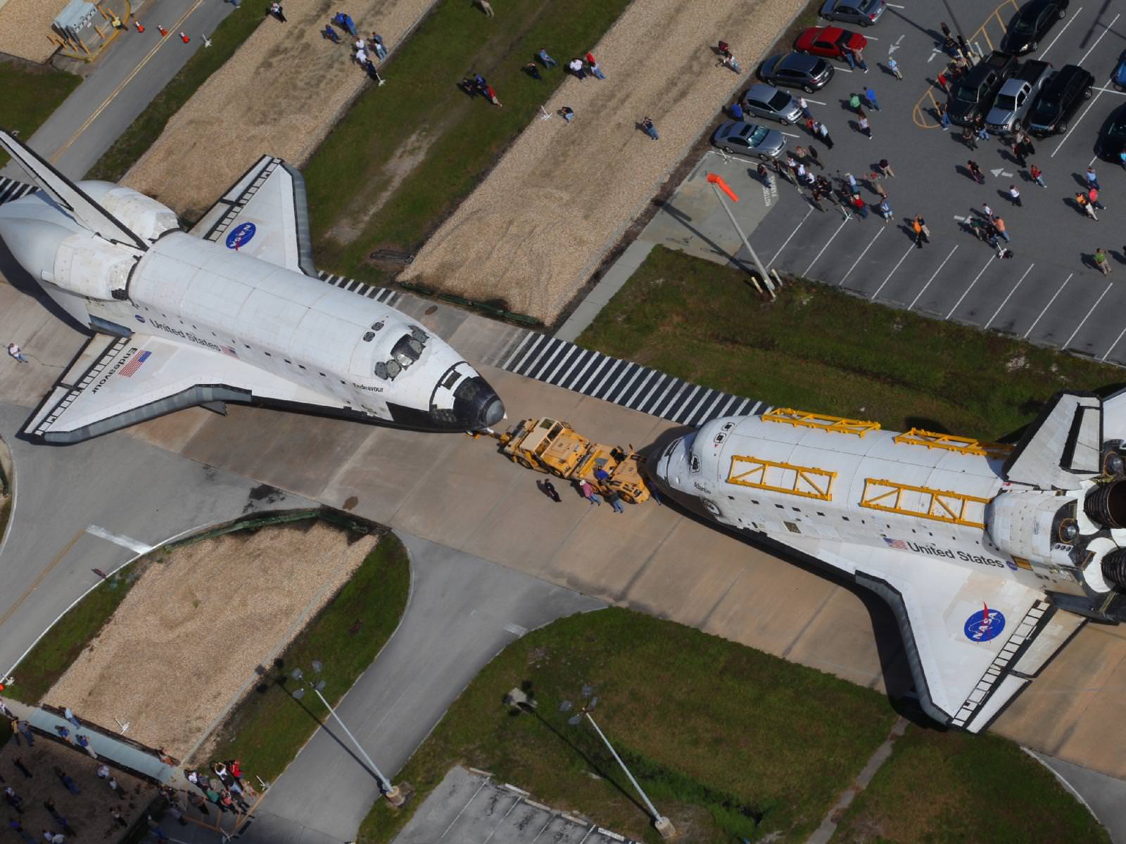 [caption id="attachment_94723" align="aligncenter" width="580" caption="Space Shuttles Discovery and Endeavour meet for a nose-to-nose encounter of gaping holes at the Kennedy Space Center on Aug. 11, 2011. The two NASA shuttles shorn of spaceflight maneuvering capability swapped locations to continue the transition to retirement and public display at museum in Virginia and California respectively. Credit: Mike Deep for Universe Today. "]