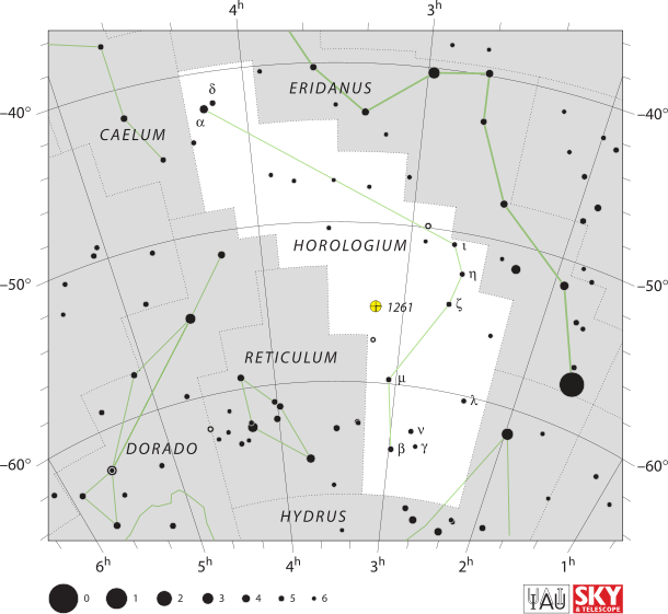 Horologium is bordered by five different constellations: Eridanus (the Po River), Caelum (the chisel), Reticulum (the reticle), Dorado (the dolphinfish/swordfish), and Hydrus (the