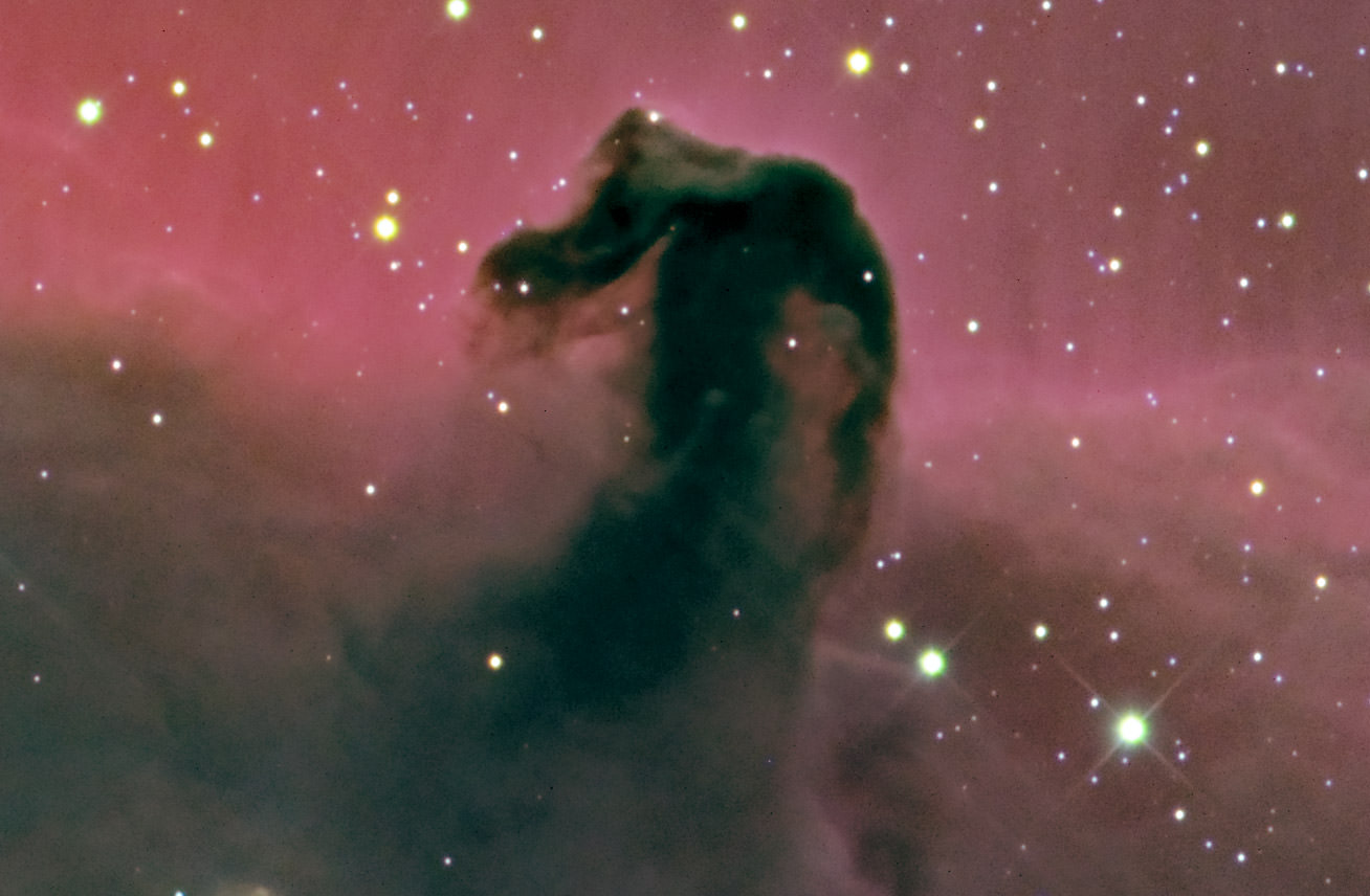 The Horsehead nebula is similar to the Pillars of Creation (in M16), though perhaps not as dense; one day it too will be eroded by the intense UV from the young stars in its vicinity, and from new-born stars formed within it (the bright area at the top left is light from just such a star).