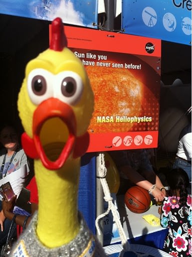 "Camilla started as an inter-office joke and soon became the mascot for the science side of the mission," said Aleya Van Doren, the formal education lead for SDO. "It is not uncommon for someone who has been working on SDO for awhile to receive a rubber chicken as sort of a 'you've earned your keep' award. She's a great moral booster for the science team, as well as being a wonderful 'hook' to get the public interested in the mission."