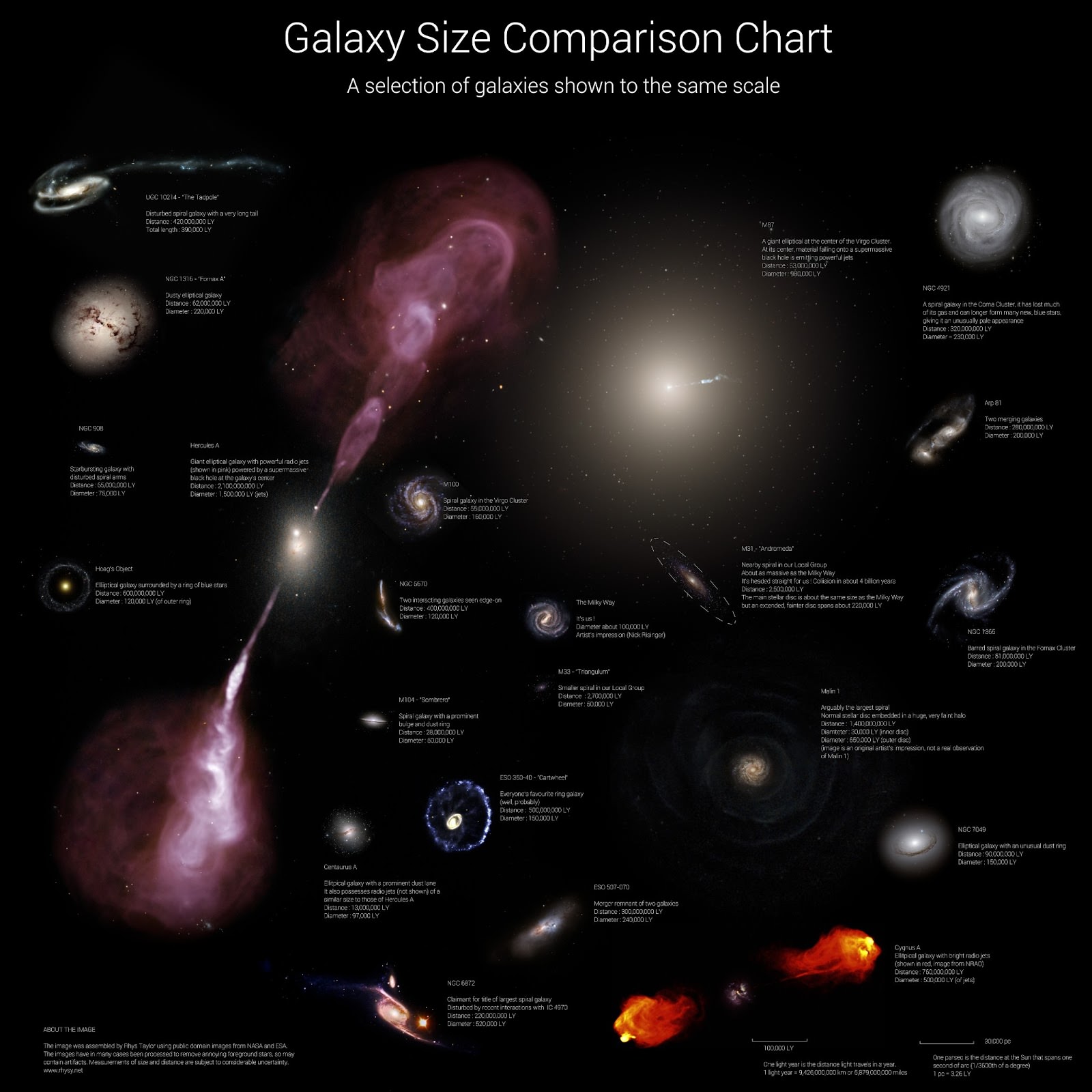 out of the way check out this graphic by Arecibo astrophysicist Rhys Taylor, which neatly illustrates the relative sizes of 25 selected galaxies using images made from NASA and ESA observation missions... including a rendering of our own surprisingly mundane Milky Way at the center for comparison. (Warning: this chart may adversely affect any feelings of bigness you may have once held dear.)