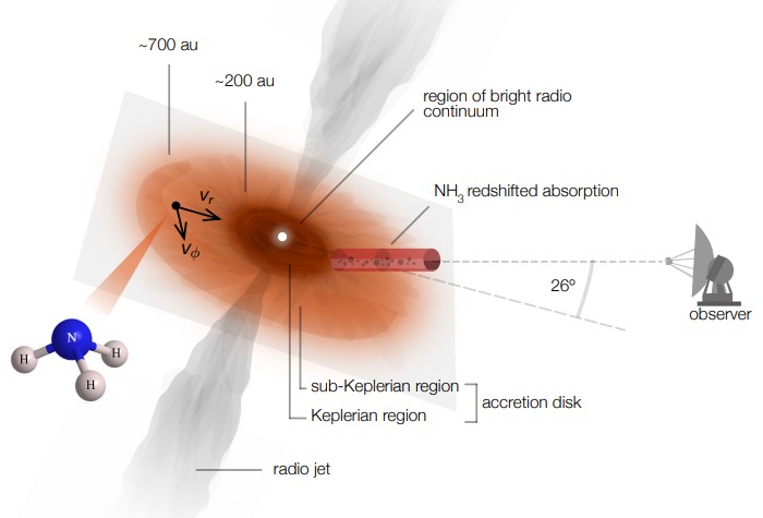 This drawing from the research explains some of the findings. The VLA detected a column of NH3 gas infalling in front of a bright continuum emission region confined inside the inner 200 au. At larger radii, the VLA mapped emissions from NH3 gas, which is both infalling (vr) by gravity toward the central star and rotating (vϕ) at sub-Keplerian velocities. Atomic (ionized) gas is also ejected away along the general direction of the system's angular momentum, with a lobe of blueshifted (approaching the observer) gas to the north and one of redshifted (receding) gas to the south. Image Credit: Sanna et al. 2025. Astronomy and Astrophysics.