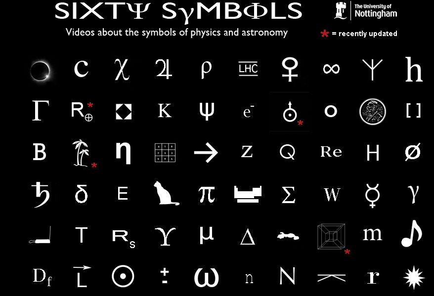 Sixty Symbols covers symbols like Lambda and the Hubble Constant (H) to the speed of light (c), imaginary numbers (j) and propulsion efficiency — explaining their meanings in everyday language, and taking advantage of the passion and the unique senses of humor the scientists at The University of Nottingham all seem to possess!