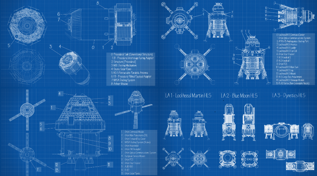 The team simulated all aspects of the cislunar mission using KSP paired with the CR3BP and COSMIC models, starting with the design of theSLSandOrion. They further considered the design of the propellant depot, which included three options: the Lunar View, a Modular Variant, and an Extended Variant. Three designs were similarly considered for the lander element, including the Lockheed Martin HLS, the Blue Moon HLS, and the Dynetics HLS. They also simulated three variations on the Halo Orbit for the Lunar Gateway and the types of transfer maneuvers. As the team stated in their paper: