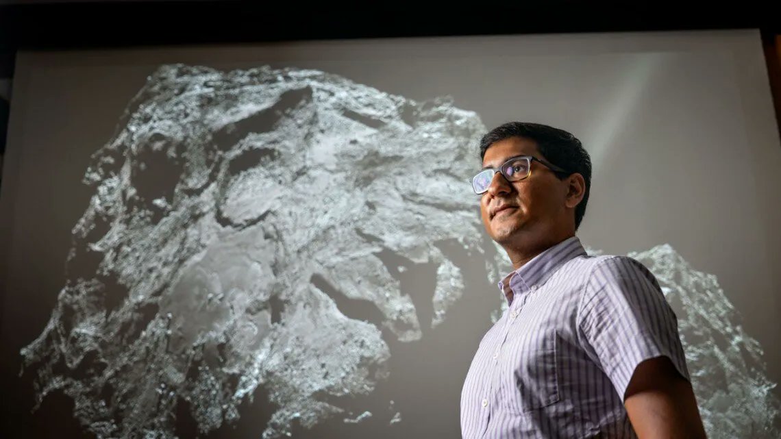 Lead author Abhinav Jindal stands in front of a picture of Comet 67P taken by Rosetta.