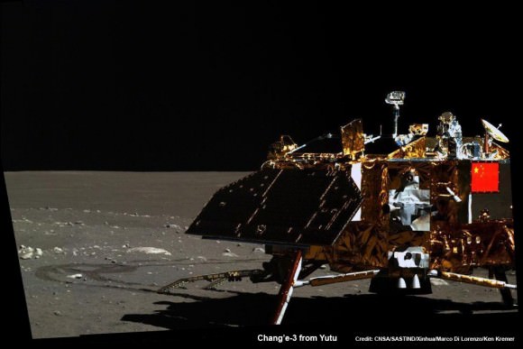 Mosaic of the Chang'e-3 moon lander and the lunar surface taken by the Yutu moon rover. Credit: CNSA/SASTIND/Xinhua/Marco Di Lorenzo/Ken Kremer
