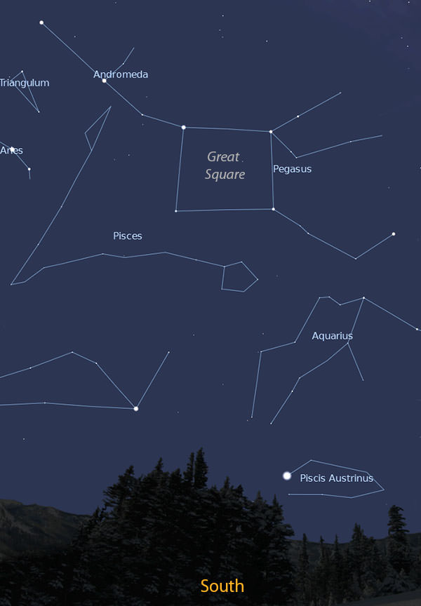 The Great Square, one of the fall sky's best known star patterns, rides high in the south at nightfall in mid-December. It forms part of the larger figure of Pegasus the Winged Horse. For our purposes today, we're going to concentrate on what's