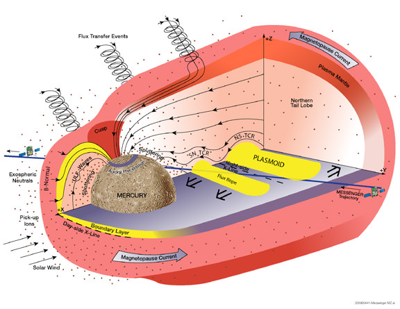 But there's a catch – Mercury's magnetic field gets in the way. MESSENGER's first flyby on January 14, 2008, confirmed that the planet has a global magnetic field, as first discovered by the Mariner 10 spacecraft during its flybys of the planet in 1974 and 1975. Just as on Earth, the magnetic field should deflect charged particles away from the planet's surface. However, global magnetic fields are leaky shields and, under the right conditions, they are known to develop holes through which the solar wind can hit the surface.