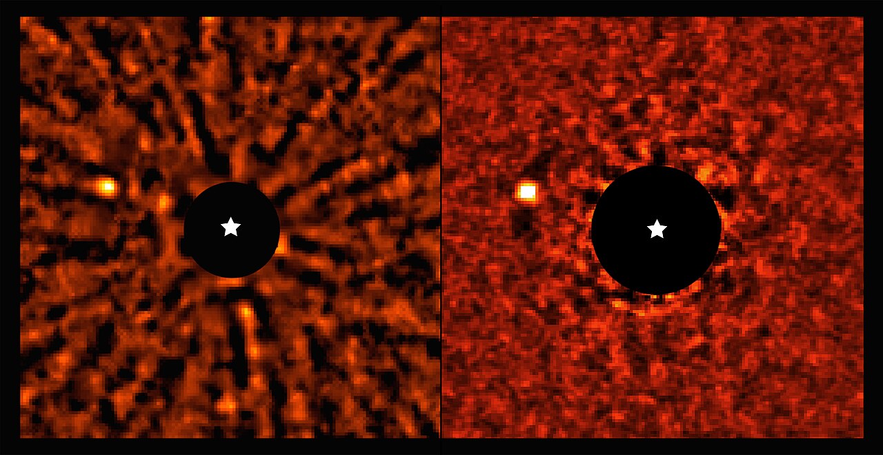 Two images of a Jupiter-like exoplanet that orbits the star AF Leporis. (Credit: ESO/MESA)