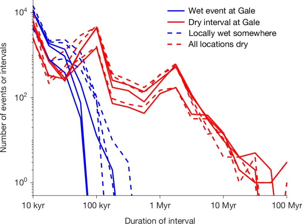 This figure shows histograms of the durations of wet events at Gale and globally in blue. Red shows durations of dry intervals within the time span of wet events. The three different lines of each type correspond to three different random orbital histories. Globally dry periods are sometimes very long and could have driven any surface life to extinction. Image Credit: Kite et al. 2025. Nature.