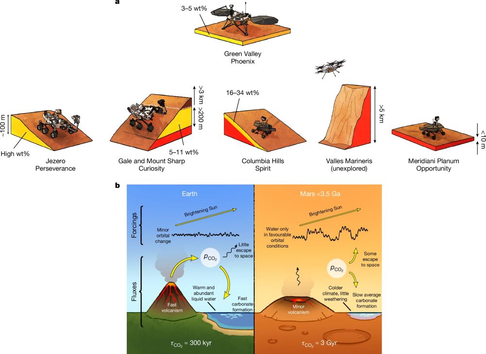 This figure from the research illustrates the researchers' model. a shows the distribution of carbonate detections in sedimentary rocks and soil on Mars, with yellow showing abundant detections, red showing no detections, and brown representing unexplored areas. b shows the fluxes and feedbacks for geologic carbon and climate regulation on Mars and Earth. On Earth, volcanic CO2 output is regulated by rapid carbonate formation. On Mars, solar brightening increased the temperature slowly and is balanced by slow carbonate formation. However, Mars' chaotic orbital forcing means that water is only available for carbonate formation intermittently during orbital optima, leading to intermittent periods of warmth and surface water. Image Credit: Kite et al. 2025. Nature.