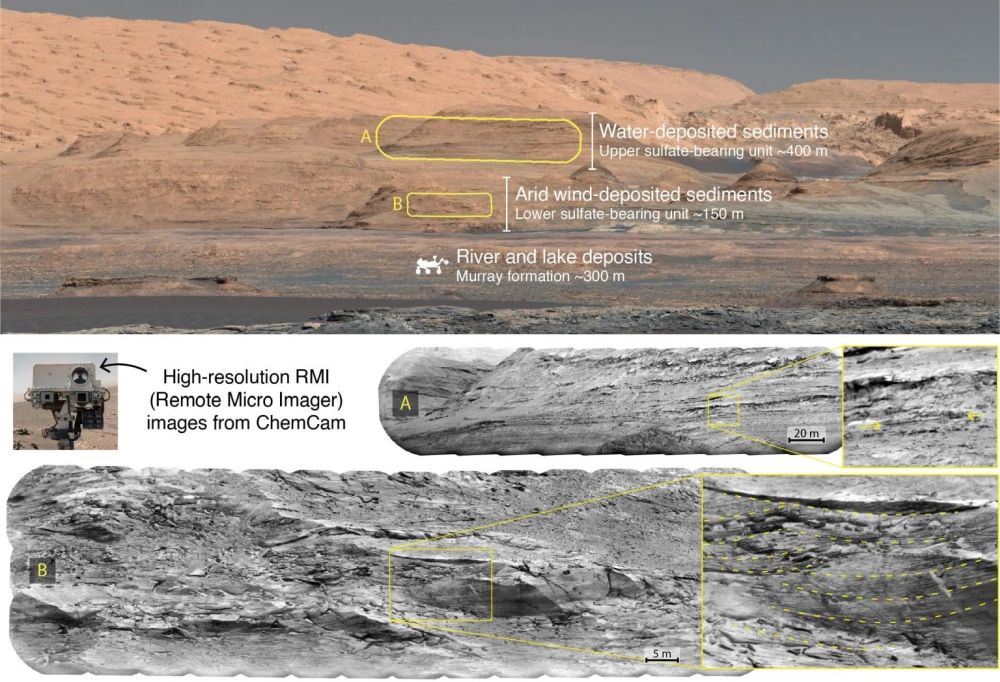 *This figure from 2021 research shows some of the detail in Mt. Sharp's stratigraphic layers. It shows the ancient conditions in which each layer of the mountain formed. Research shows that Mars had alternating periods of wet and dry until it dried out completely about 3 billion years ago. Image Credit: NASA/JPL-Caltech/MSSS/CNES/CNRS/LANL/IRAP/IAS/LPGN*