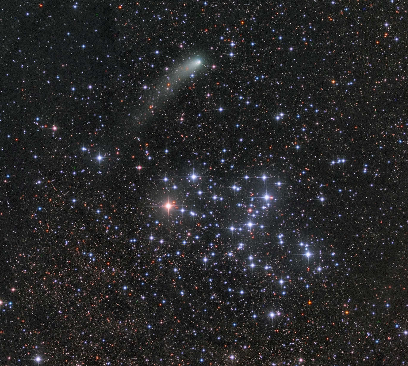 The fluffball passed the glittery Butterfly Cluster (M6) in Scorpius on October 9 displaying an attractive curved tail pointing southeast.