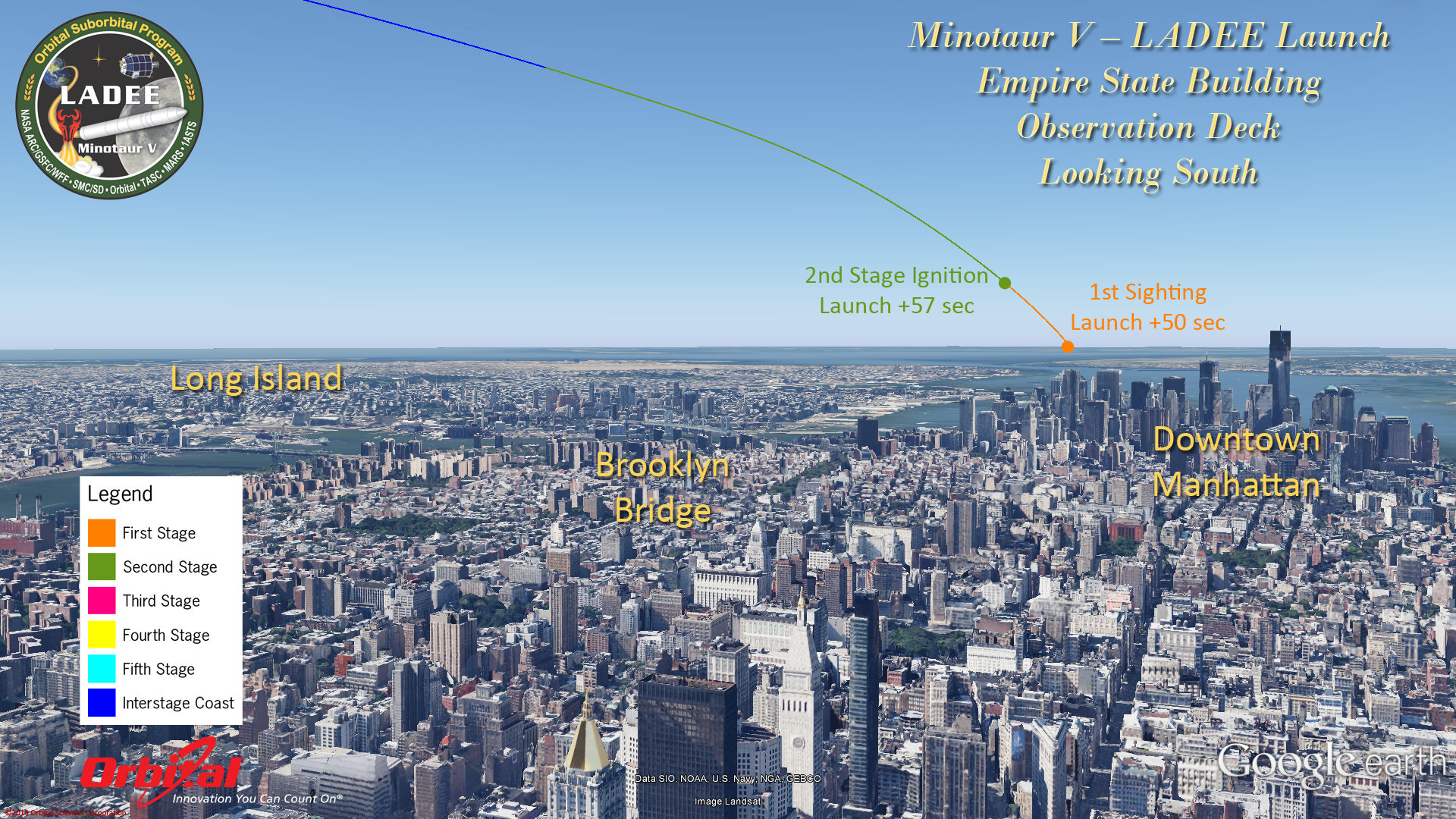 Minotaur V rocket and LADEE spacecraft launch trajectory view as should be seen from atop the Empire State Building, NY, on Sept. 6, 2013 at 11:27 p.m. EDT - weather permitting.