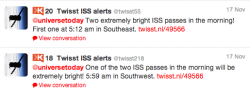 . They can figure out your location and then send you a notification when the station is about to fly overhead via Twitter.