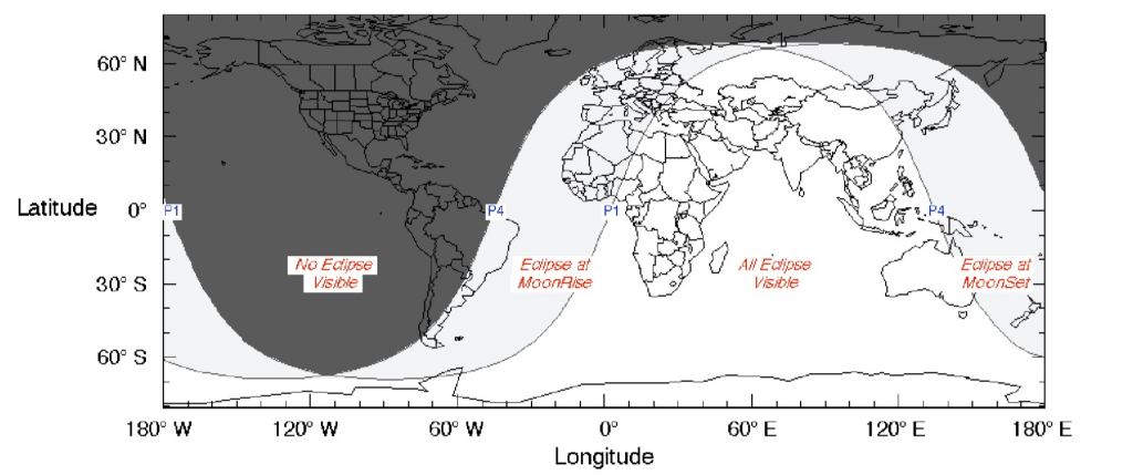 Brazil, western Africa and most of Europe will see the eclipse underway at moonrise Friday night, while the remainder of Africa and most of Asia see the entirety of the eclipse. Northeast Asia and New Zealand see the eclipse end towards moonset and dawn. Only North America misses out on the eclipse entirely.