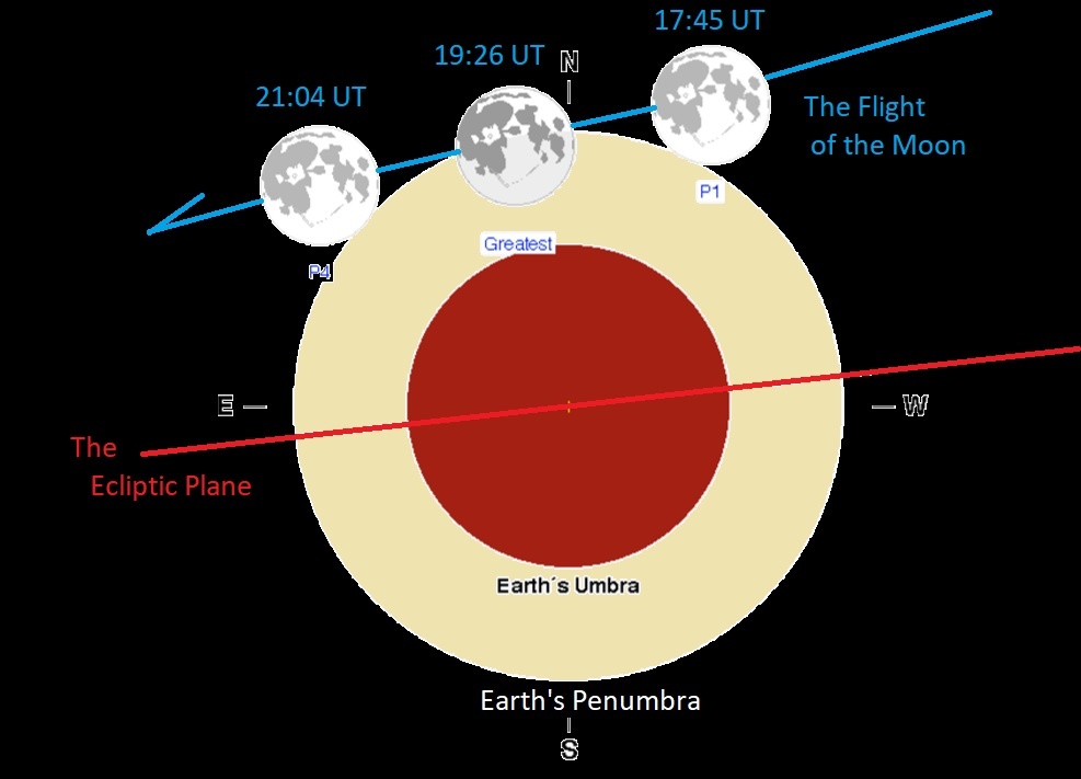 The eclipse occurs on June 5thfrom 17:45 Universal Time (UT) to 21:04 UT, and is visible from Europe and Africa eastward to Asia and Australia. Maximum eclipse occurs at 19:26 UT, with the Moon 59 percent immersed in the umbral shadow of the Earth. The entire duration of the eclipse is 3 hours 18 minutes and 13 seconds.