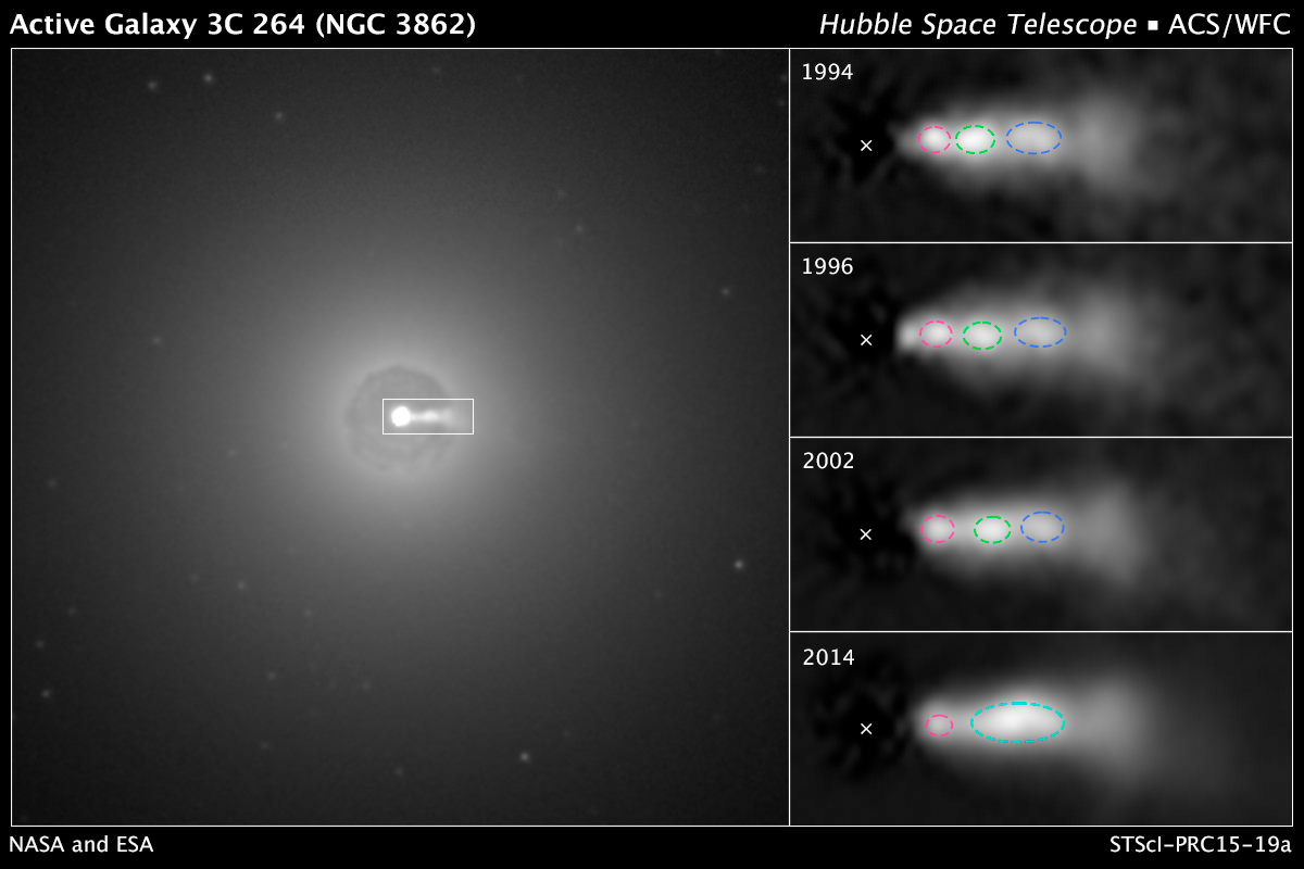 (STScI) in Baltimore, Maryland identified movement in visible clumps of plasma within the jet emitted from the nucleus of NGC 3862 (aka 3C 264). One of the outwardly-moving larger clumps could be seen gaining on a slower, smaller one in front of it and the two eventually collide, creating a shockwave that brightens the resulting merged mass dramatically.
