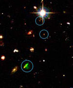 The second Hubble study uncovered, for the first time, a proto-cluster of "infant galaxies" that existed more than 12 billion years ago (at redshift 4.1). These galaxies are so young that astronomers can still see a flurry of stars forming within them. The galaxies are grouped around one large galaxy. These results will be published in the Jan. 1, 2004 issue of Nature. The paper's lead author is George Miley of Leiden Observatory in the Netherlands.