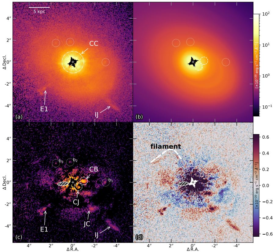 "With the STIS coronagraphic observations, we also identify a core blob (CB) component, as well as other point-sourcelike objects, after removing isophotes from the host galaxy," the authors continue. "The nature of the newly identified components, as well as the point source-like objects, would require observations from other telescopes for further study."