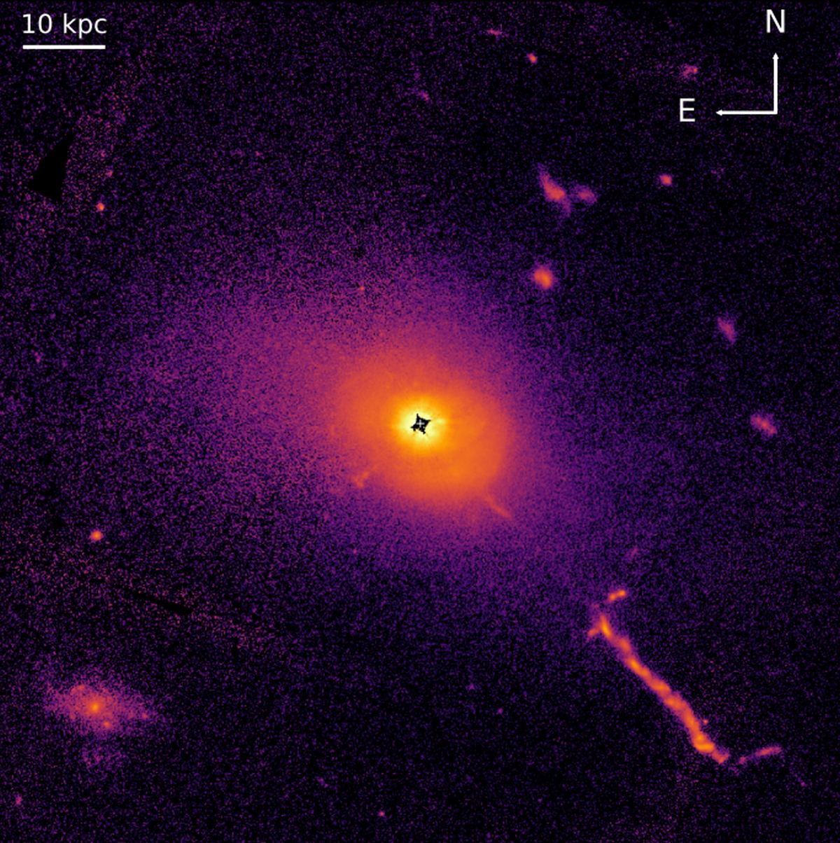 There are also filamentary structures to the northeast, east, and west of the galactic nucleus. They extend as far as 10 kiloparsecs (32,600 light-years) from the nucleus. The authors explain that they're similar to structures observed in other galaxies, where they're thought to be multiphase gas that's condensing out of the intergalactic medium. This gas could be fuelling AGN feedback. AGN feedback is a self-regulating process that links the energy released by the AGN to the surrounding gaseous medium.