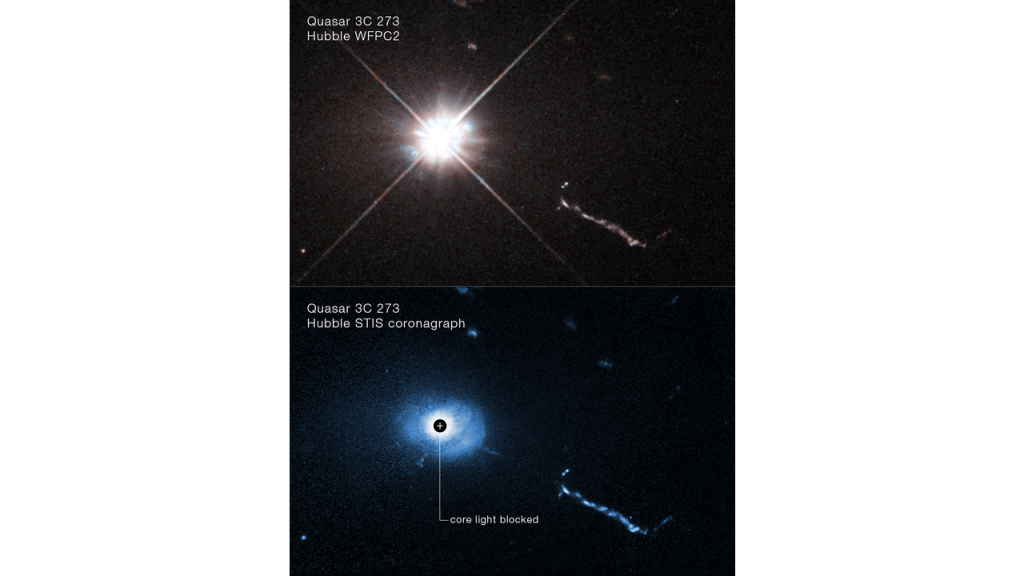 3C 273 is about 2.5 billion light-years away and is the most distant object visible in a backyard telescope. Recently, Hubble captured its best view of the quasar, revealing previously unseen details in its vicinity.
