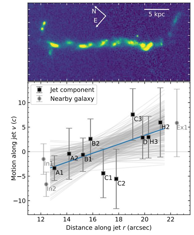 Previous observations of the same quasar 22 years ago allowed the authors to compare images and constrain some properties of the previously observed Inner Jet, which is 300,000 light-years long. "We witness a potential trend that the motion is faster when it is further out," they write.