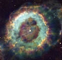 The remnant stellar core in the center is now sending out a flood of ultraviolet (UV) light into the surrounding gas. The prominent blue-green ring, nearly a light-year in diameter, marks the location where the energetic UV light has stripped electrons off of atoms in the gas. This process is called ionization. In the redder gas at larger distances from the star, where the UV light is less intense, the ionization process is less advanced. Even farther outside the main body of the nebula, one can see fainter wisps of gas that were lost from the star at the beginning of the ejection process.