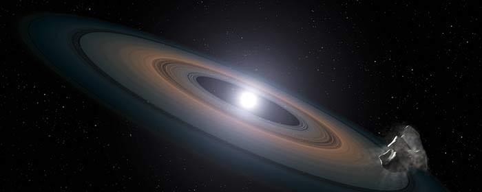 Ring around the rosie? You bet. This leftover material swirling around the white dwarf stars could mean that planet formation happened almost simultaneously as the stars were born. At their collapse, the surviving gas giants may have had the gravitational "push" to relocate asteroid-like bodies into "star-grazing orbits".