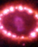 This image, taken Nov. 28, 2003 by the Advanced Camera for Surveys aboard NASA's Hubble Space Telescope, shows many bright spots along a ring of gas, like pearls on a necklace. These cosmic "pearls" are being produced as a supersonic shock wave unleashed during the explosion slams into the ring at more than a million miles per hour. The collision is heating the gas ring, causing its innermost regions to glow.