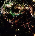 This photo shows the upper rim of the supernova remnant's expanding shell. Near the top of the image are dozens of tiny clumps of matter. Each small clump, originally just a small fragment of the star, is tens of times larger than the diameter of our solar system.