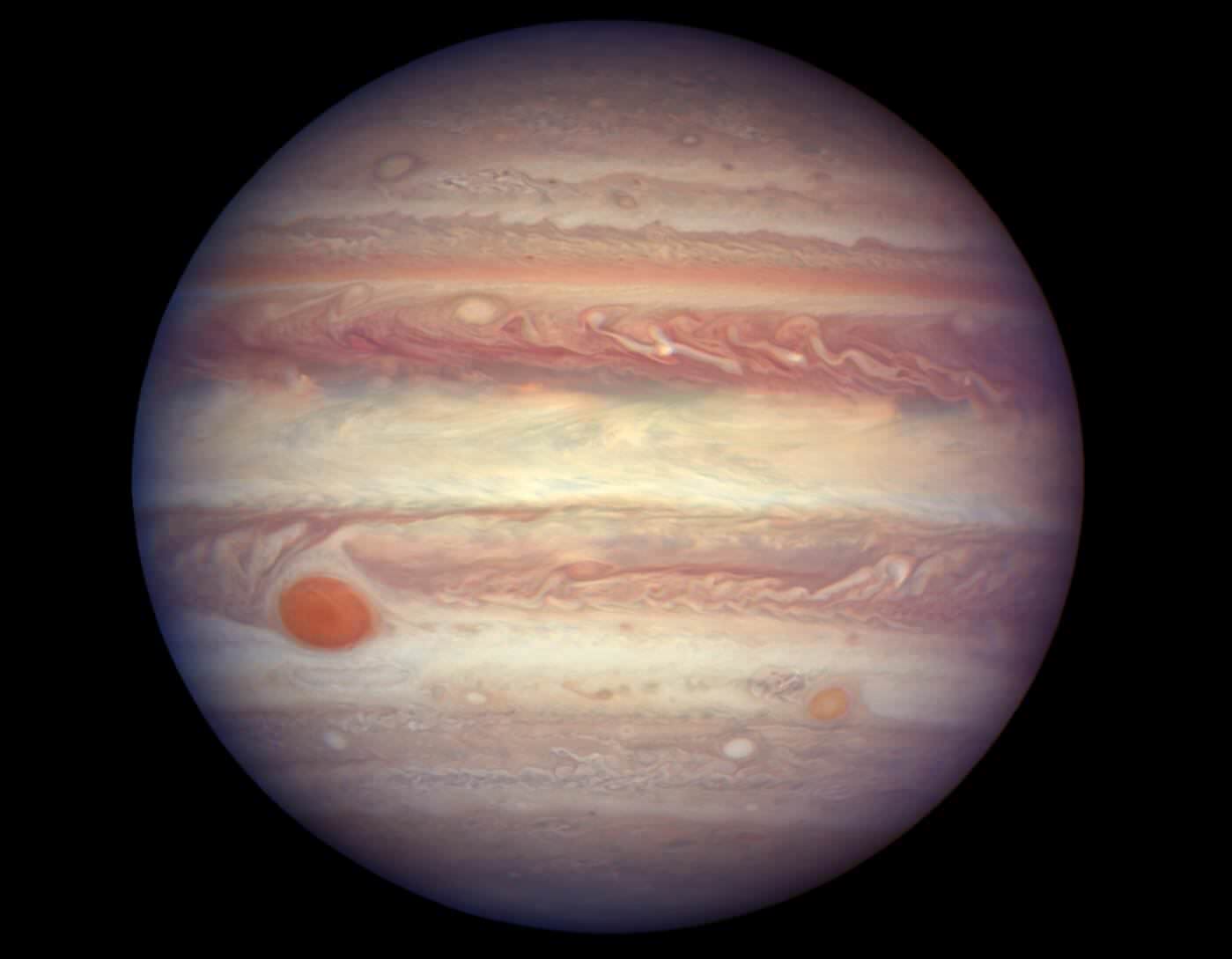 , Hubble was able to observe Jupiter in the visible, ultraviolet and infrared spectrum. From these observations, members of the Hubble science team produced a final composite image that allowed features in its atmosphere - some as small as 130 km across - to be discernible. These included Jupiter's colorful bands, as well as its massive anticyclonic storms.