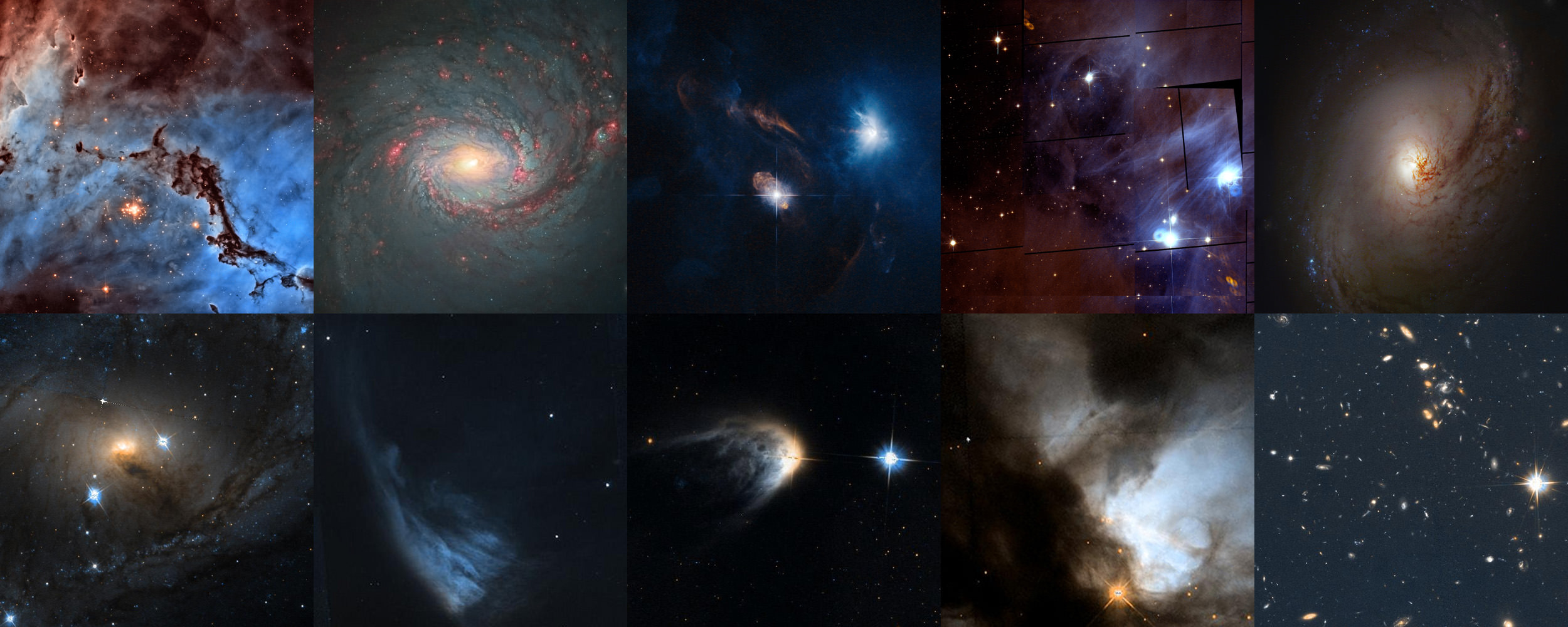 Top image caption: Top ten images selected in the Hubble Hidden Treasures image processing competition. Top row: NGC 1763 by Josh Lake, M 77 by Andre van der Hoeven, XZ Tauri by Judy Schmidt, Chamaeleon I by Renaud Houdinet, M 96 by Robert Gendler. Bottom row: SNR 0519-69 by Claude Cornen, PK 111-2.1 by Josh Barrington, NGC 1501 by kyokugaisha1, Abell 68 by Nick Rose, IC 10 by Nikolaus Sulzenauer. Credit: NASA & ESA