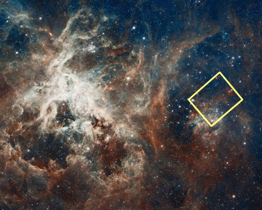 For context, the image below is a wide image of the Tarantula Nebula showing where the Hubble image is located.