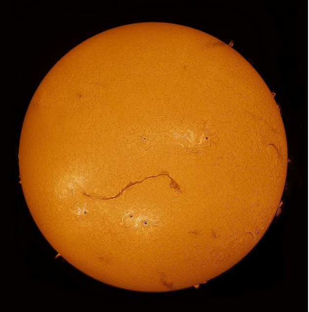 Caption: High resolution full disc hydrogen alpha composite of the Sun on August 5, 2012, comprising of 6 images for the disc and 5 images for the prominences.Credit: Paul Andrew on Flickr.