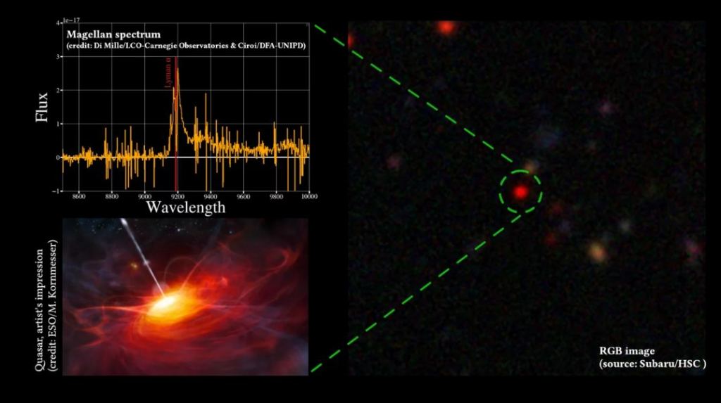 This increased luminosity allowed astronomers to find a black hole that was feasting on material only 800 million years after the Universe began.