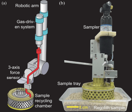 In the new paper, the researchers took a hybrid approach to developing their regolith sampling system. It utilizes a pneumatic drill that punches a hole in the regolith rather than spinning to drill one directly. After the hole is punched, the system retracts the drill bit and pushes gas down into the hole to force some of the particles up in a sample collector.