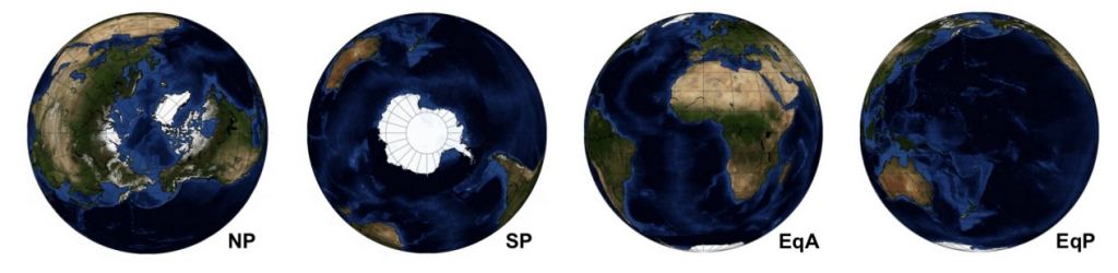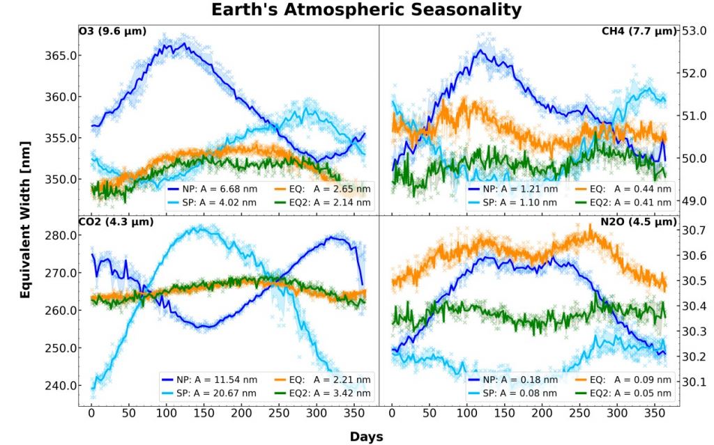 The study looked at four different observing geometries: one centred on the north and south poles, one on the African equatorial, and one on the Pacific equatorial. The spectra were observed with the Atmospheric Infrared Sounder aboard NASA's Aqua satellite.