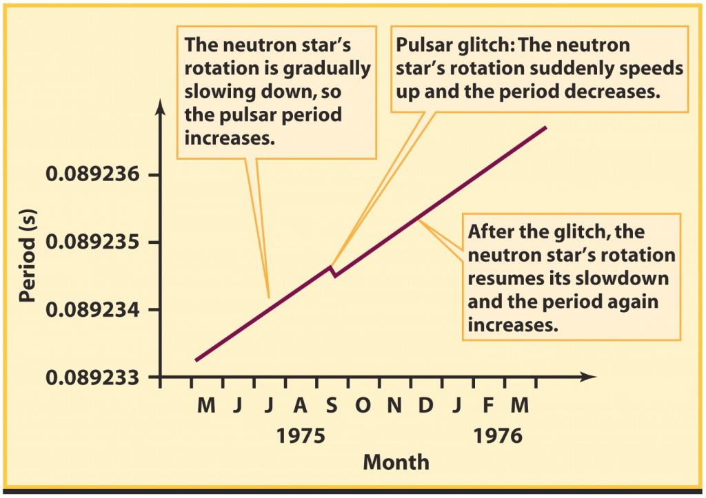 We know that neutron stars are geologically active thanks to pulsars. The strong magnetic fields of a neutron star can generate beams of radio energy that sweep the sky with each rotation. When those beams align in our direction, we can see regular pulses of radio light. These pulses are extremely regular, and over time they gradually slow down by a tiny amount as the neutron star loses rotational energy. But every now and then a pulsar will "glitch" and experience a small uptick in rotation. This is due to the crust of the star shifting, causing a starquake.