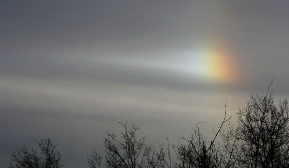 An especially colorful sundog with a 'tail'. Red light is bent less than blue as it emerges from the ice crystal, tinting the sundog's inner edge. Blue is bent more and colors the outer half. If you look closely, all colors of the rainbow are seen. Credit: Bob King[/caption]