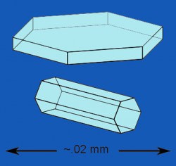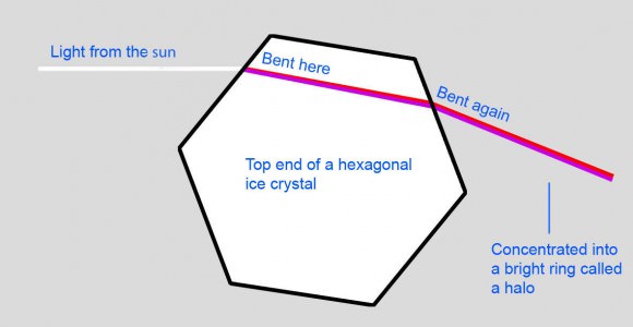 This is the top end of a hexagonal column-shaped ice crystal. Light refracting (bending) through the 60-degree angled faces of millions of these crystals is concentrated into a ring of light 22 degrees from the sun. As light leaves the crystal, the shorter blue and purple wavelengths are refracted slightly more than red, tinting the outer edge of the halo blue and inner edge red. Credit: Donalbein with additions by the author[/caption]