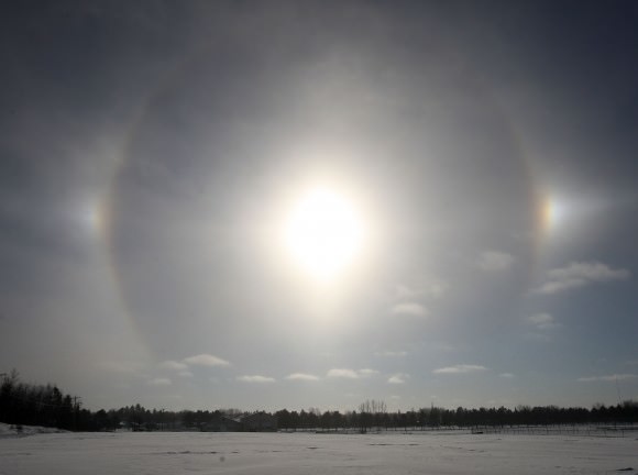 The sun on Dec. 6, 2013 with a 22-degree halo and two luminous canine companions or sundogs. Similar halos and 'moondogs' can be seen around a bright moon. Credit: Bob King[/caption]